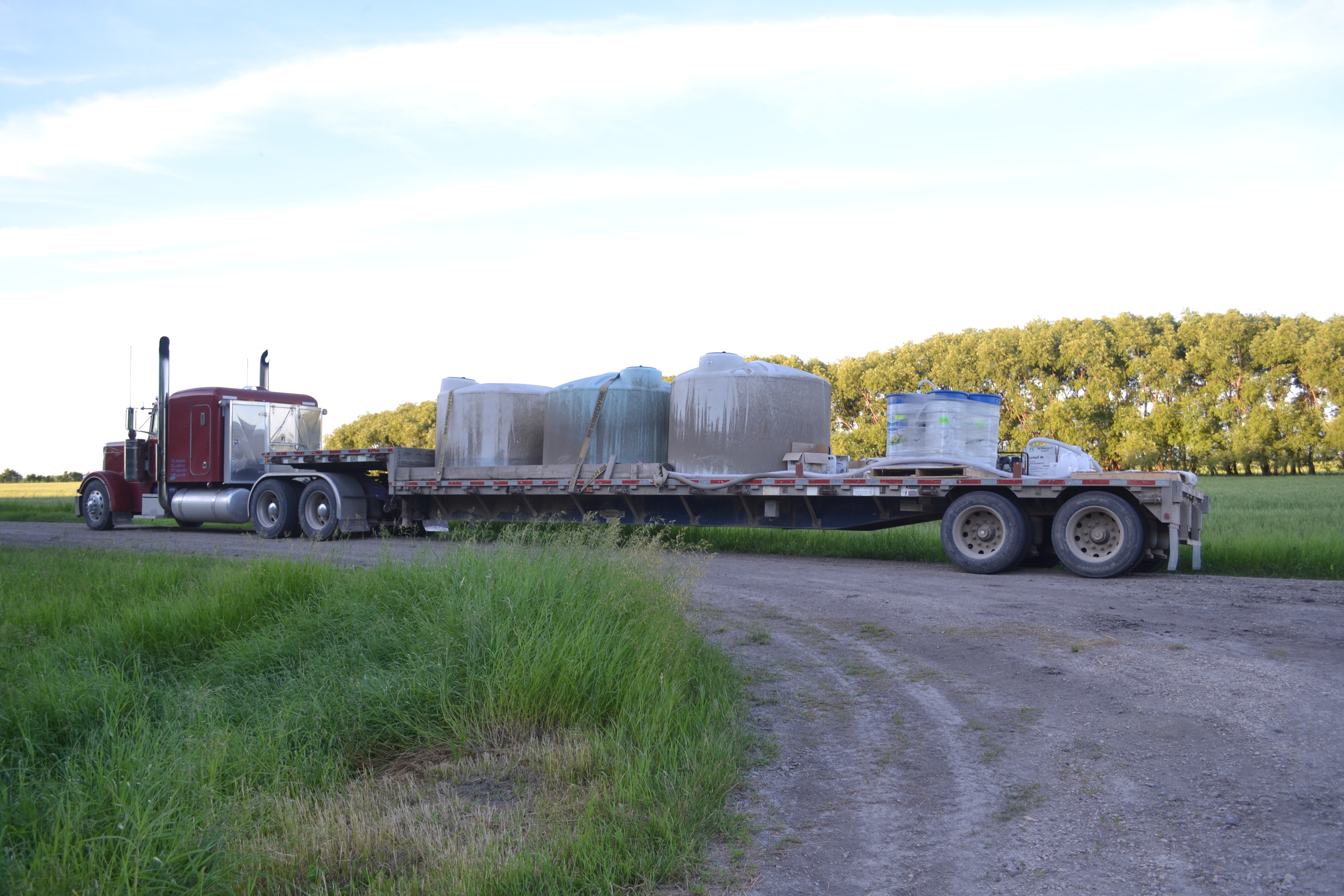 A few weeks ago I wrote about Seeding. Click here to read the blog post if you missed it. Today I’m going to talk briefly about Spraying, an important part of growing a crop. My young farmer brother Derek does all the spraying on our family farm. Spraying can be a stressful job as you’re working with thousands of dollars worth of products and you don’t want to mess up and waste it. Spraying costs farmers a lot of money but is necessary to control disease, weeds and insects, and ensure a healthy, uniform crop. Each field is usually sprayed more than once, each time addressing a different concern (disease, weed or insect). The product is mixed with water and then applied to the field. As you can see in the photos below, we haul huge water tanks on a flat deck trailer. We get the water from a nearby community well.
