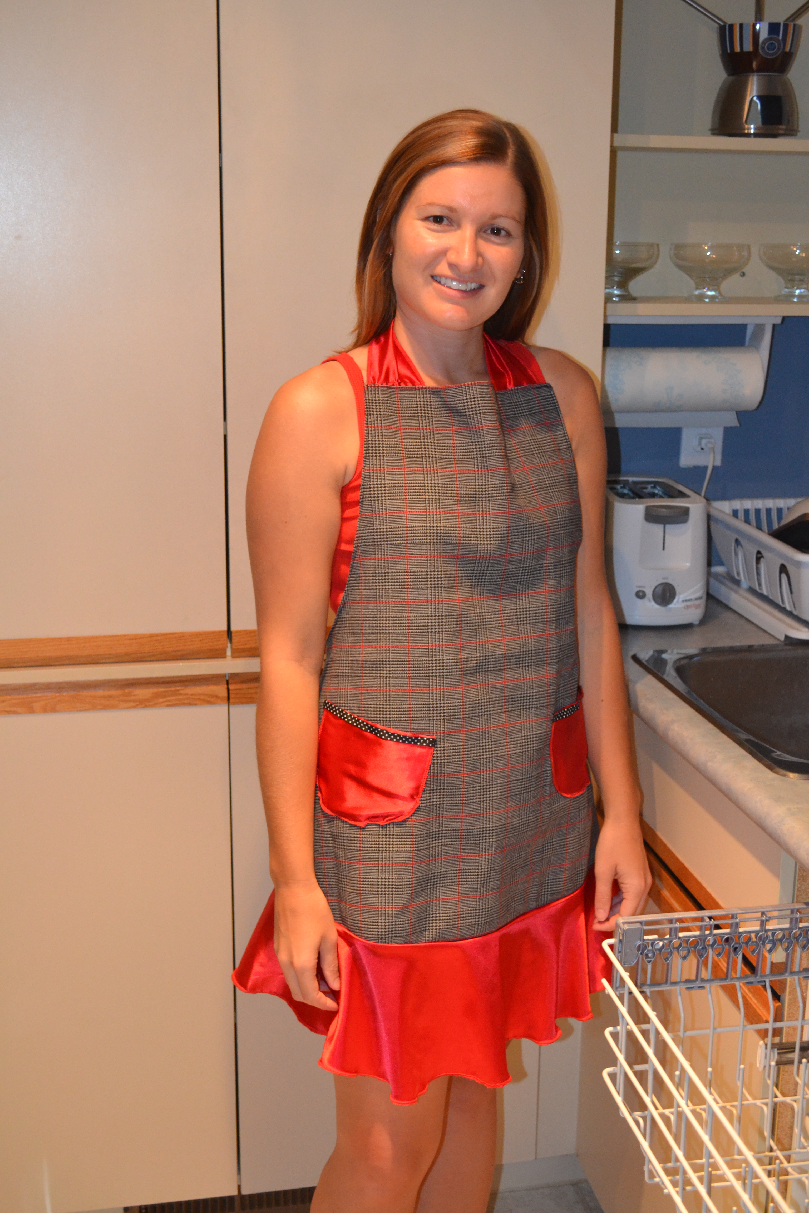 Modelling my new apron in my kitchen.