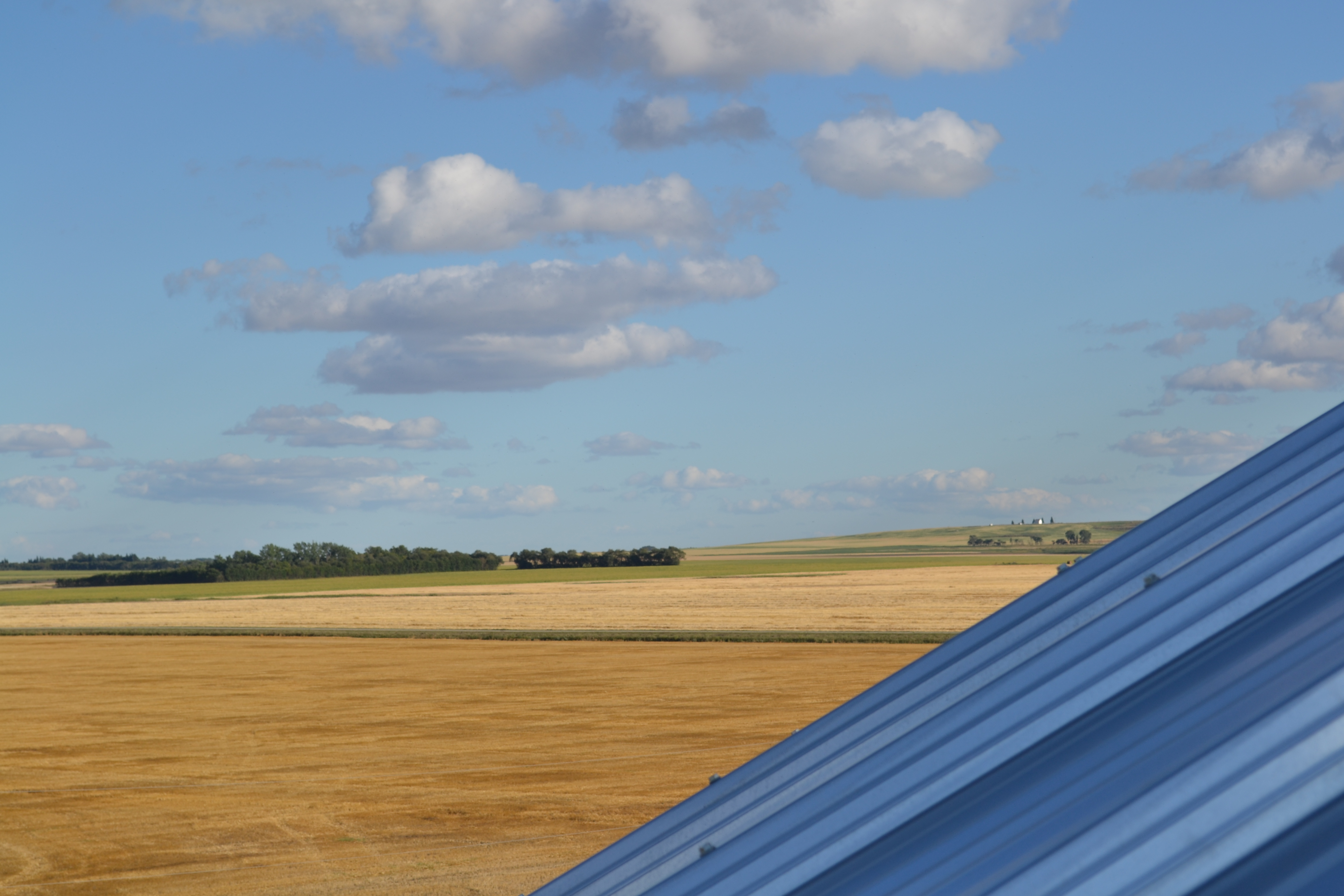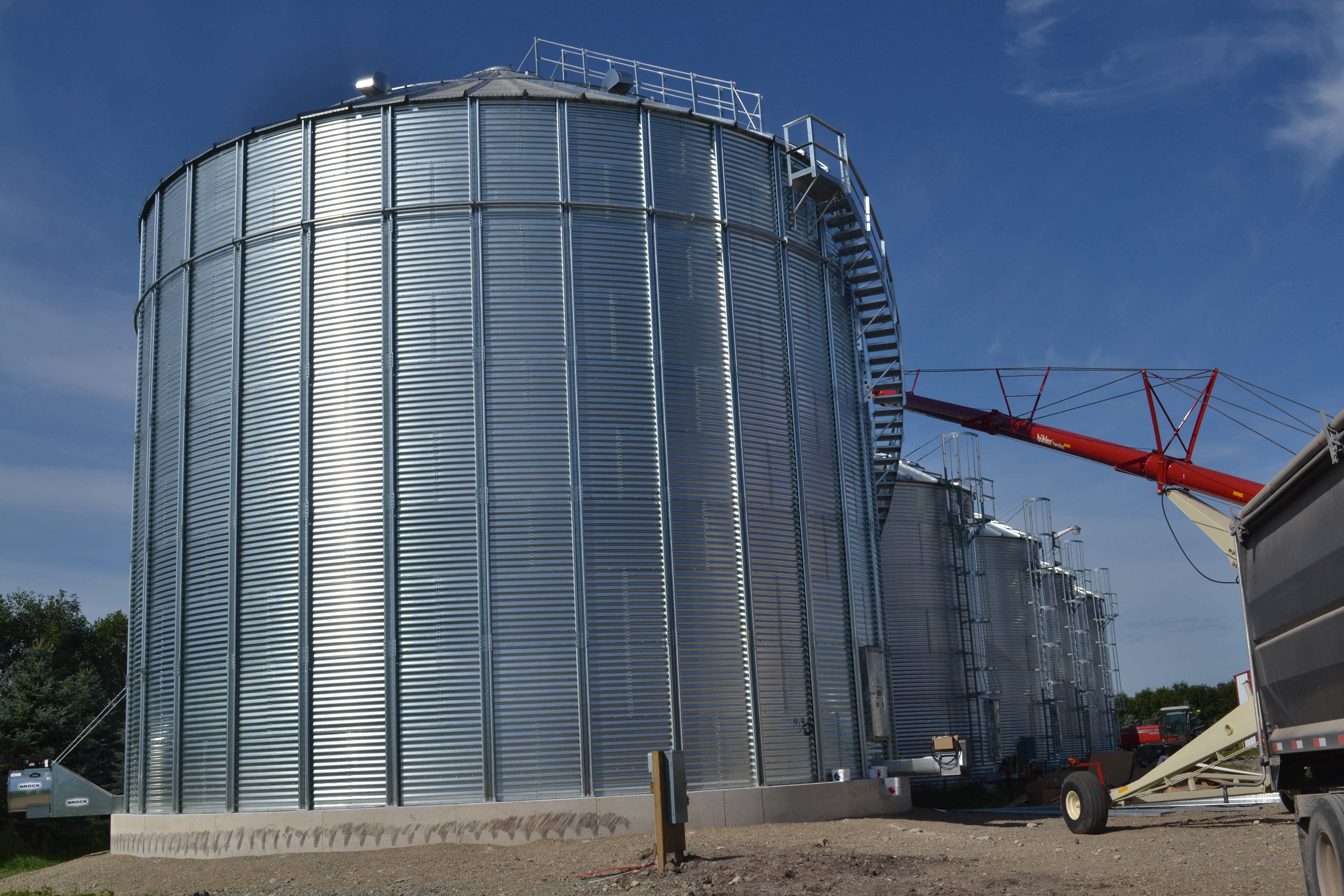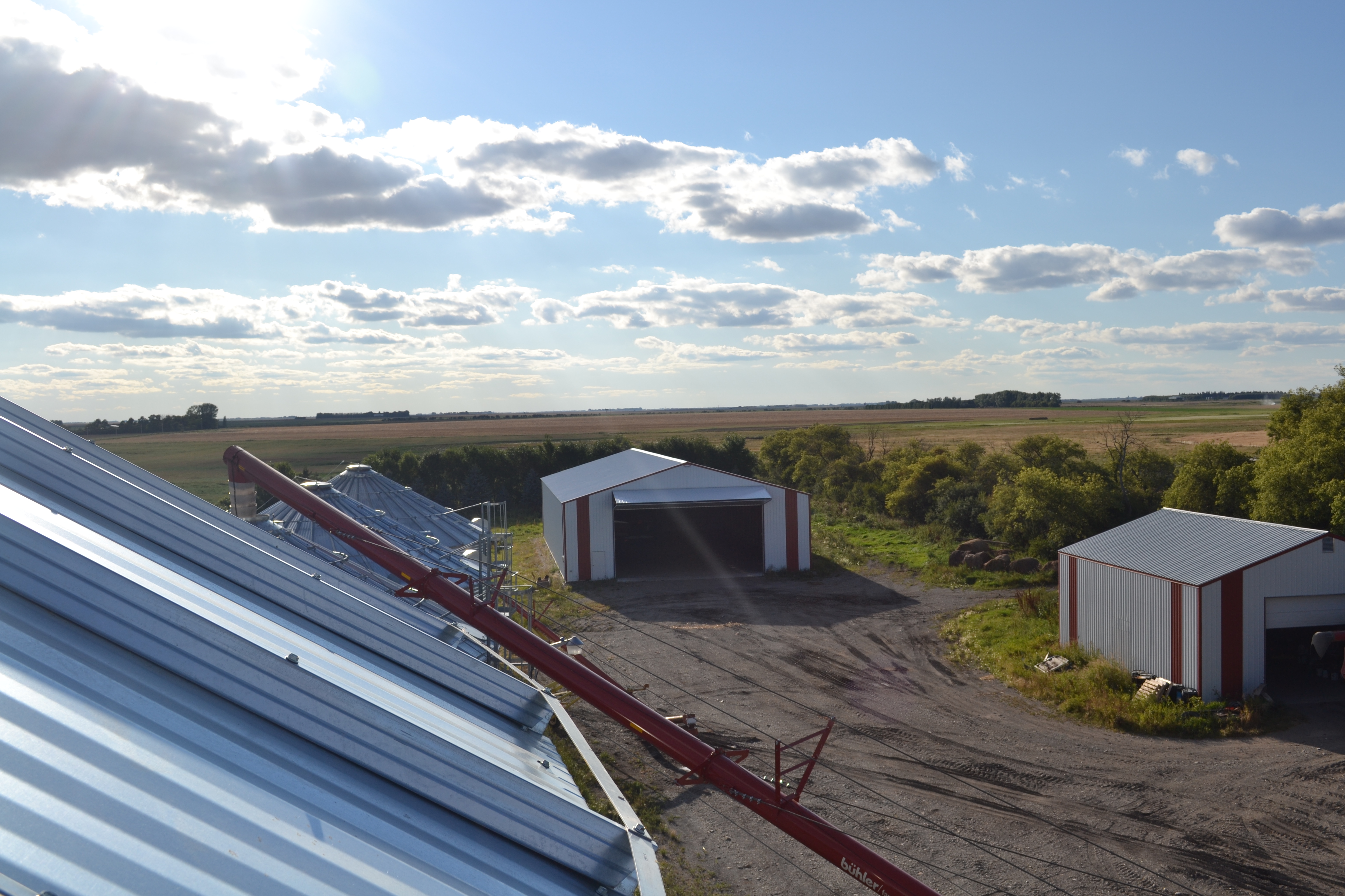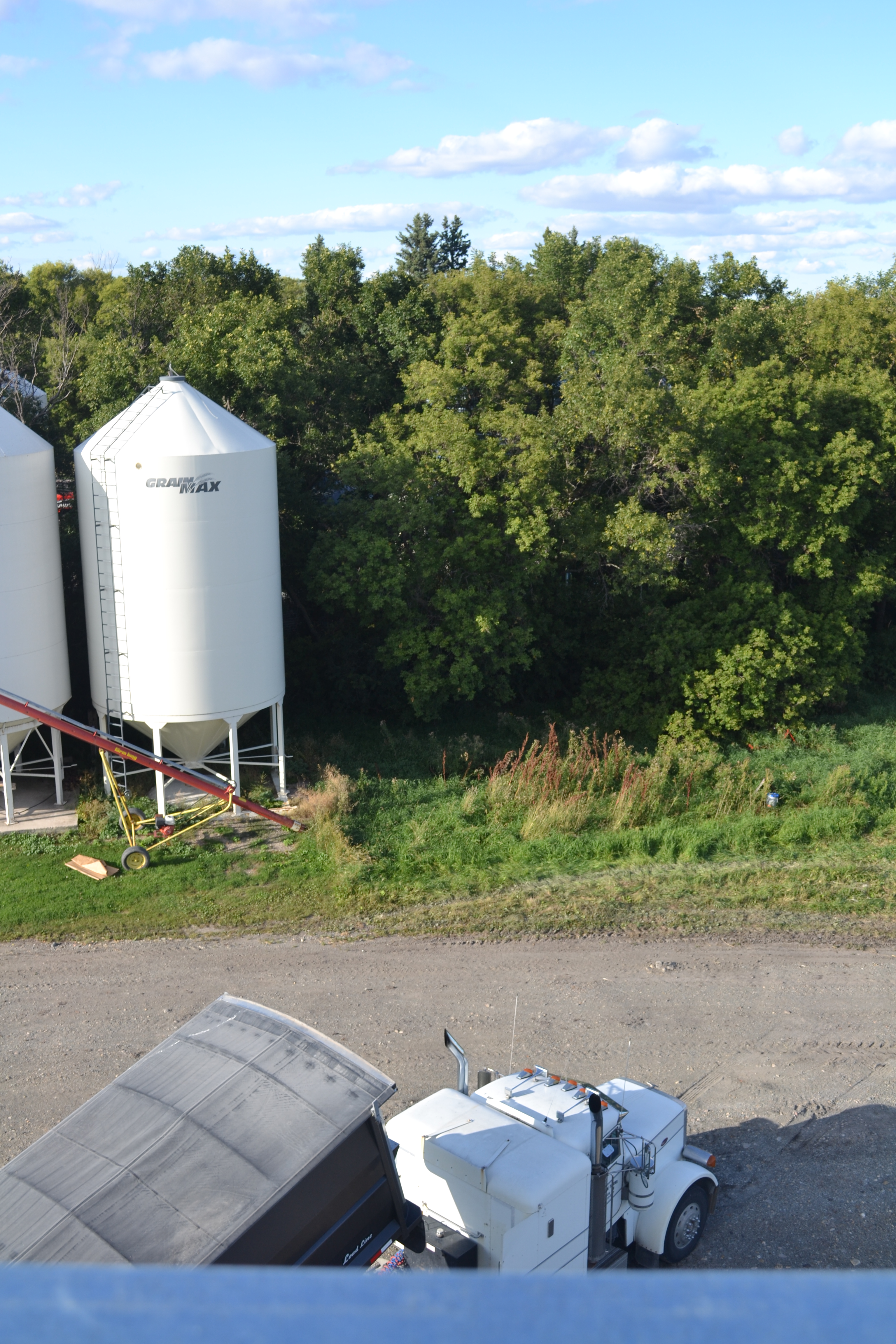 I can jump out of a plane at 13,000 feet and jump off a ledge from 47 metres up (sky diving and bungy jumping in New Zealand last winter), and yet I had to work up the courage to climb to the top of the new grain bin on my family farm. I finally did it this past weekend and the view from the top was worth it. And I noticed that the longer I stayed up there the more relaxed I was. The first photo below shows you the full size of the grain bin. The stairs begin on the other side, wrap around and end in the front. The second photo is proof that I made it almost to the top – to the landing (photo taken by my brother). And the last few photos are some views from the top. Enjoy!