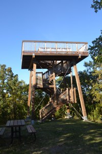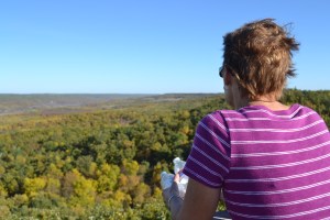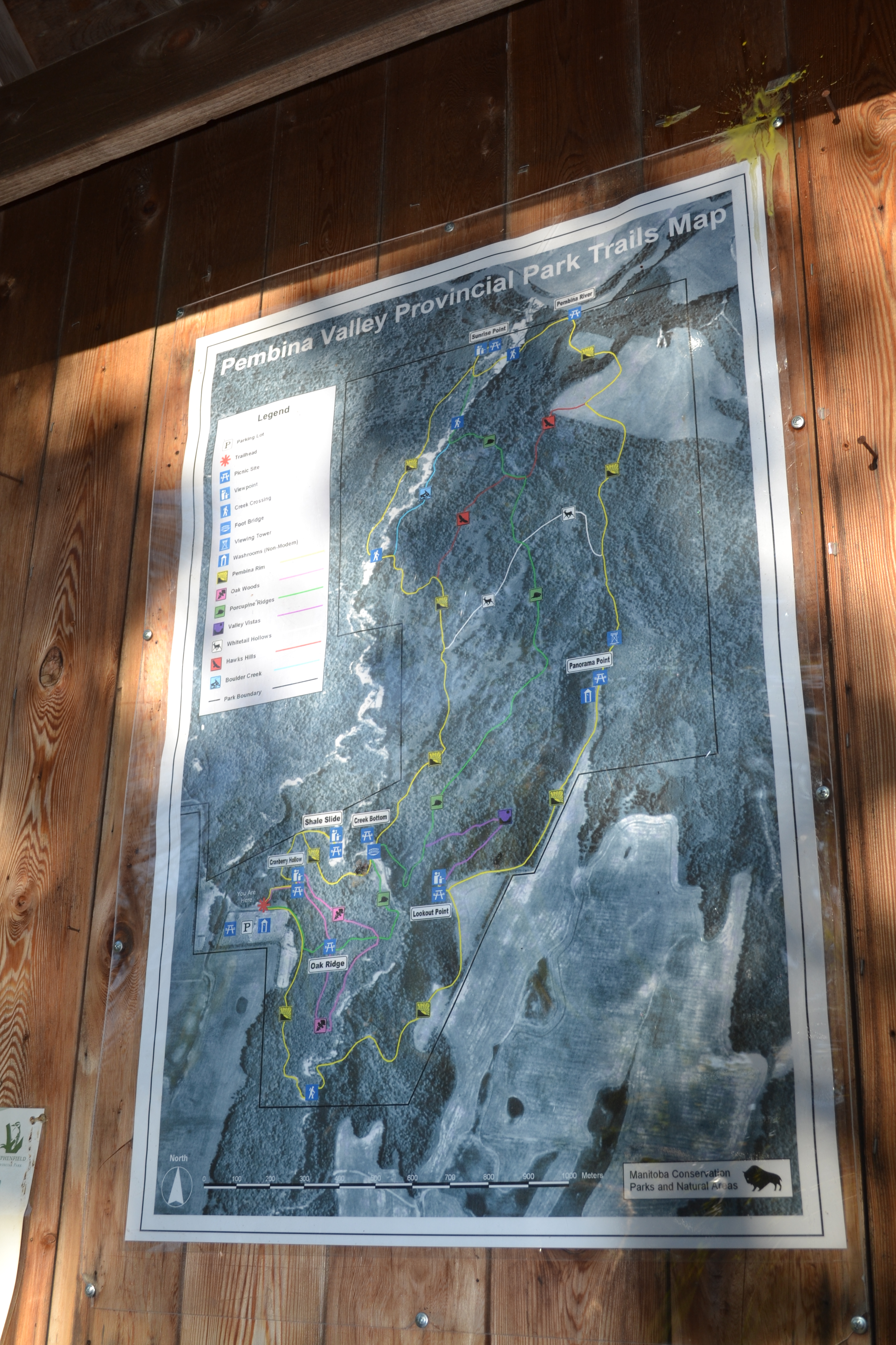 My mom and I took advantage of a beautiful fall day last Sunday afternoon and went for a hike in the Pembina Valley Provincial Park, which is approximately 30 minutes east of my family farm travelling on a curvy gravel road running parallel to the North Dakota border (for a few miles the road is on the border). The Pembina Valley Provincial Park lies on the edge of the Pembina Valley and is 440 acres. We were ready for a workout and an adventure so we decided to take the longest trail called the Pembina Rim, which is the yellow trail on the map below. Hiking this trail took us approximately two hours, which included a few short breaks to enjoy the scenery and gulp down some water. But not too much water as I didn’t want to visit the outhouse pictured below. Needless to say, I have bad childhood memories of using the outhouses at the Snowflake ball diamonds. I had this fear that either I’d fall in the hole or something that was living in the hole would jump up and bite me in the butt! Honestly, I’d rather go in the bushes using leaves as toilet paper. But I digress.