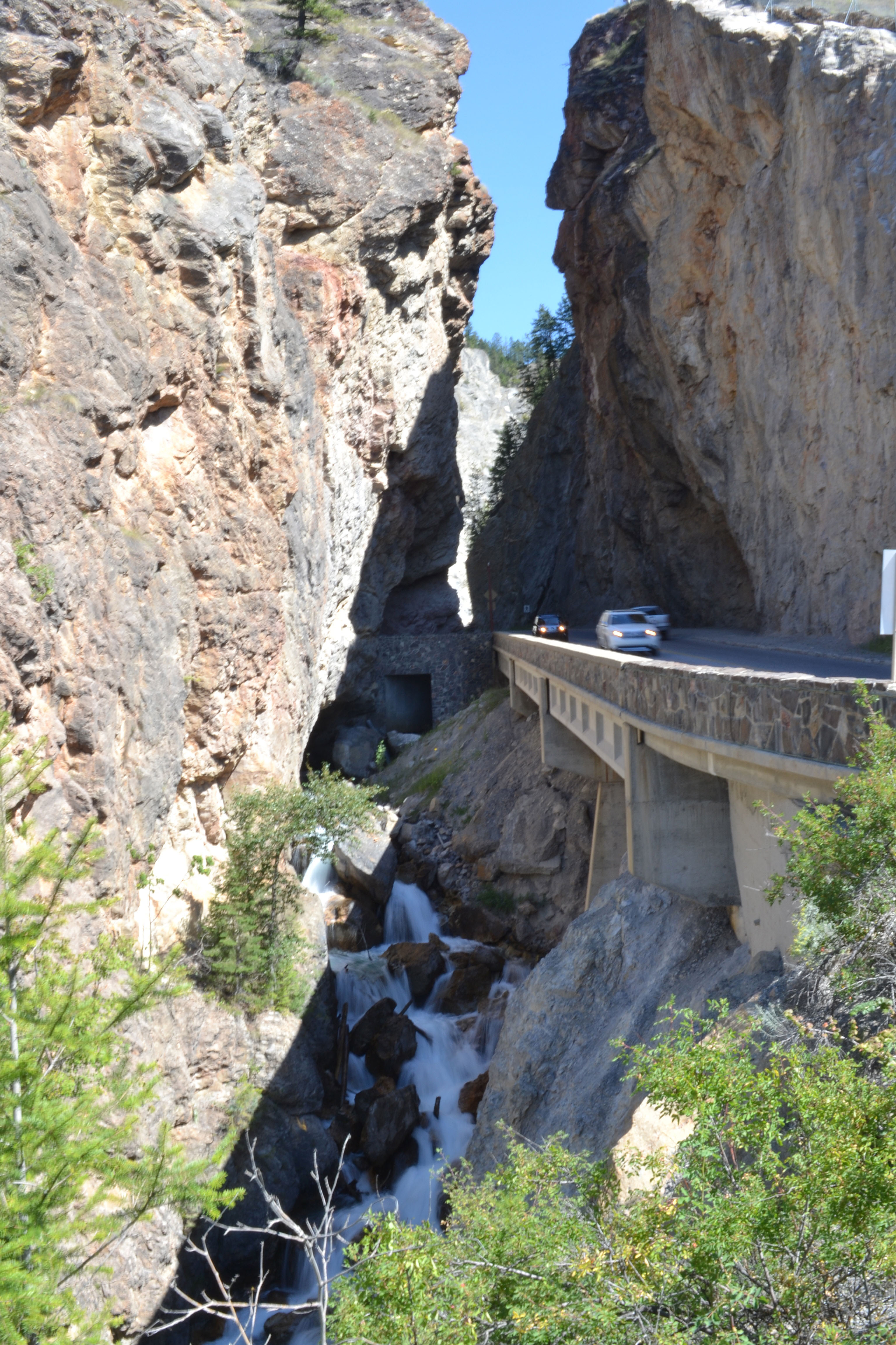 Waterfalls and a narrow pass carved through the mountains near Radium, BC.