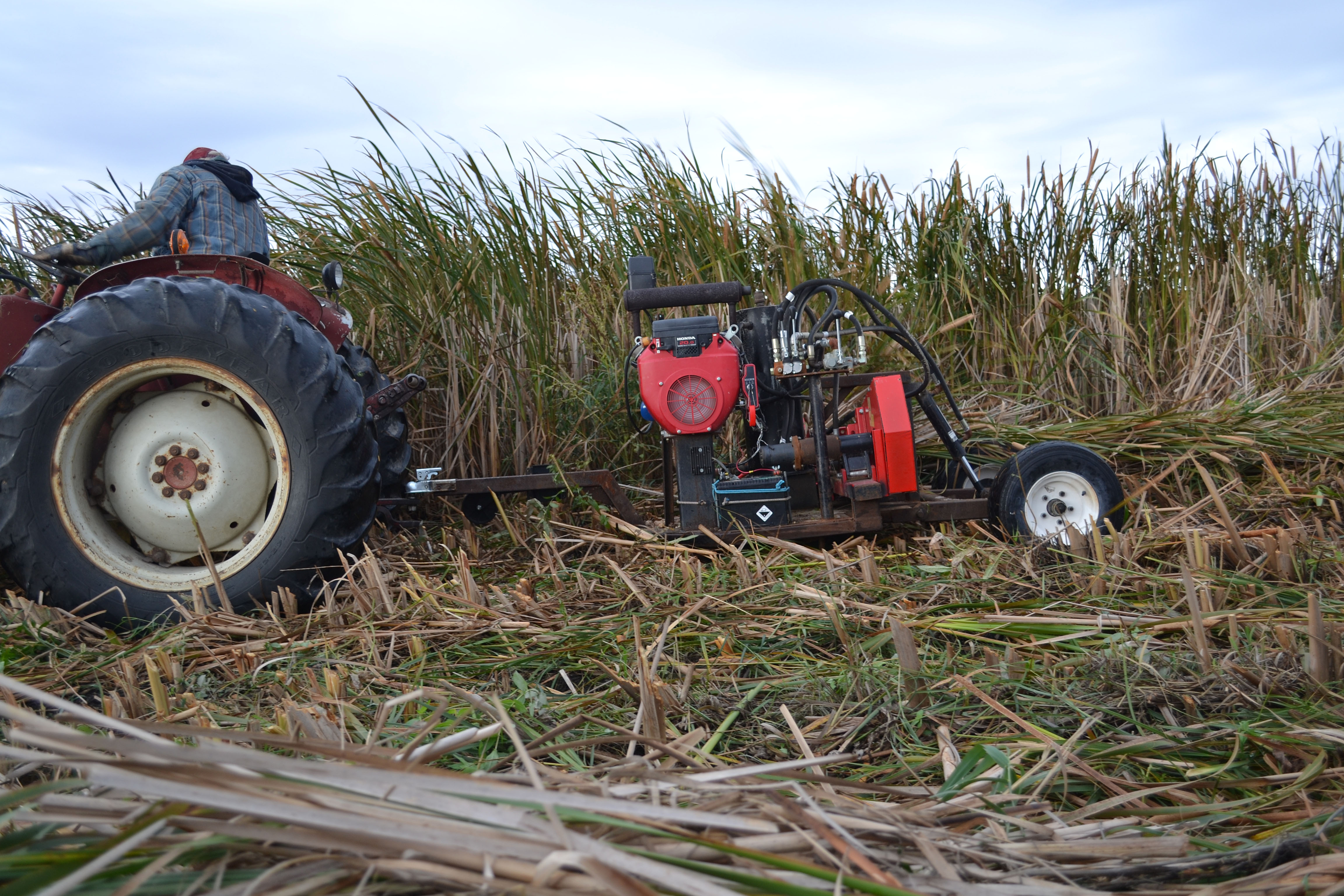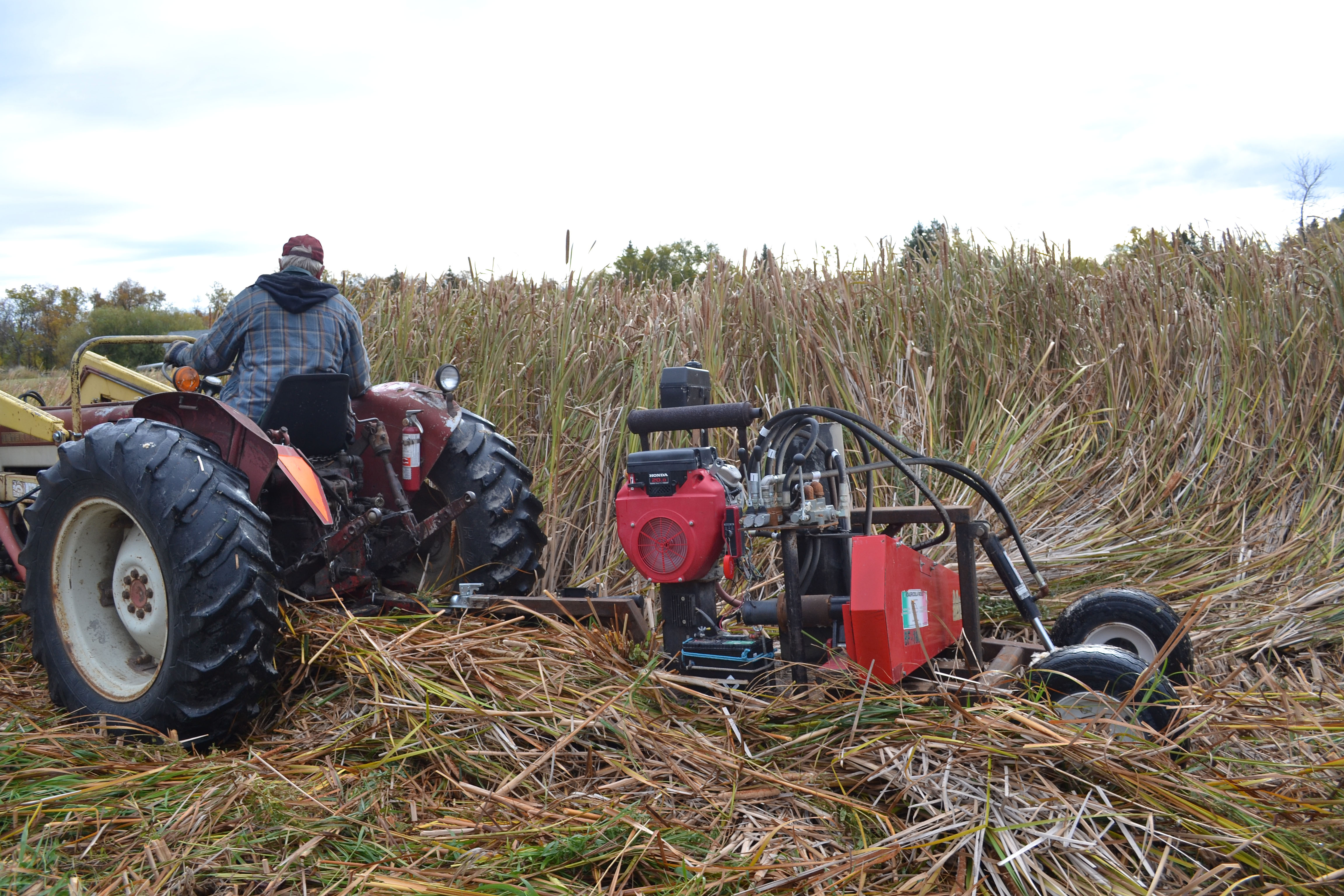Harvesting cattail. This machine, pulled behind a tractor, is used to cut down the cattail. It dries in swaths and is then baled.