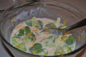Gradually add 1 and 1/2 cups milk to three tbsp flour in a microwavable bowl. Beat with a wire whisk so it’s well blended. Microwave on high for four minutes stirring occasionally. Add 1 cup shredded cheddar cheese and 3 cups broccoli. Mix well. You can also add 1/2 tsp thyme but I didn’t have any so I just threw in some salt and pepper.