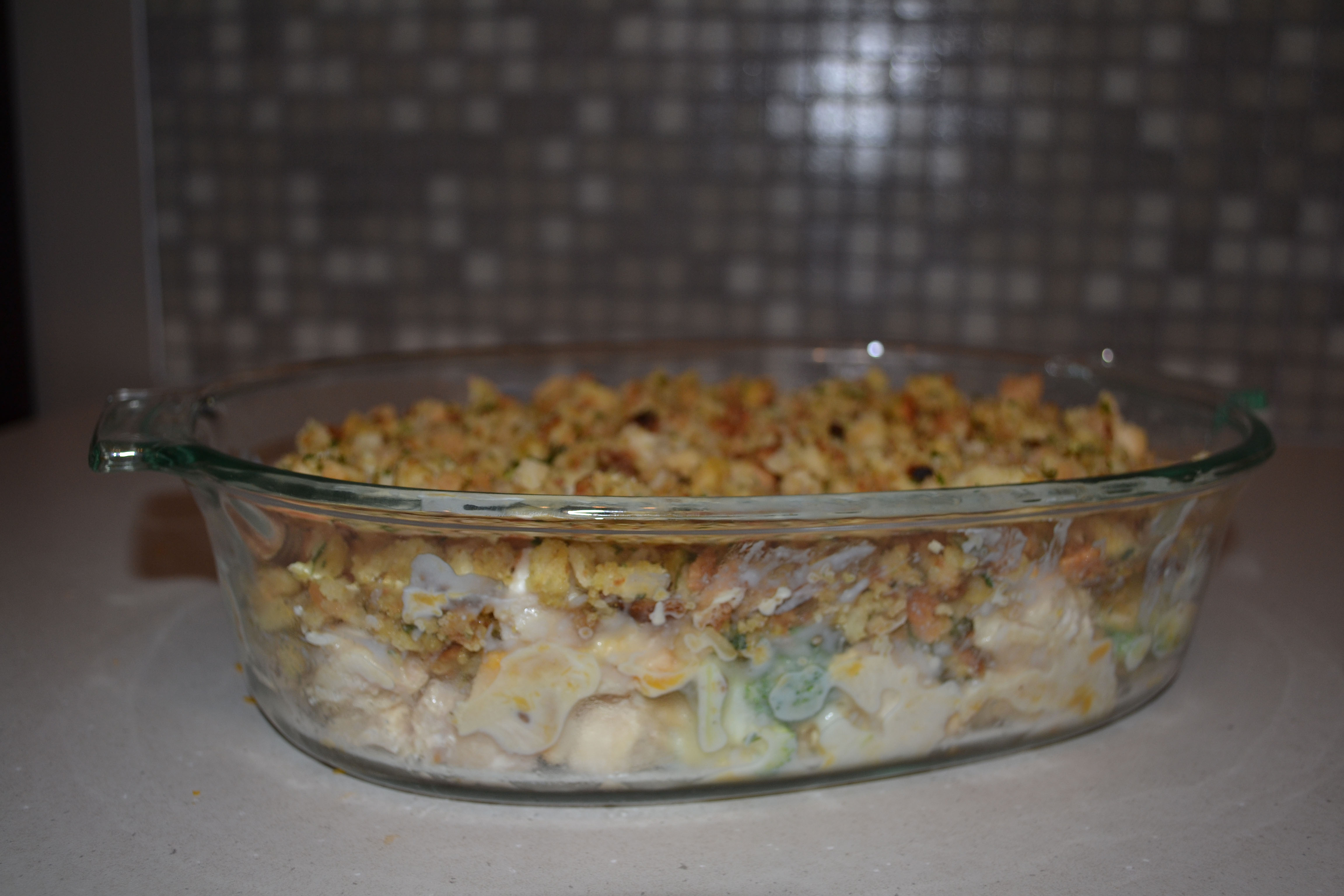 Finally pour the cheese and broccoli sauce over the chicken. Place in casserole dish and top with the stuffing. Bake at 350 F for 25 to 30 minutes or until heated through.