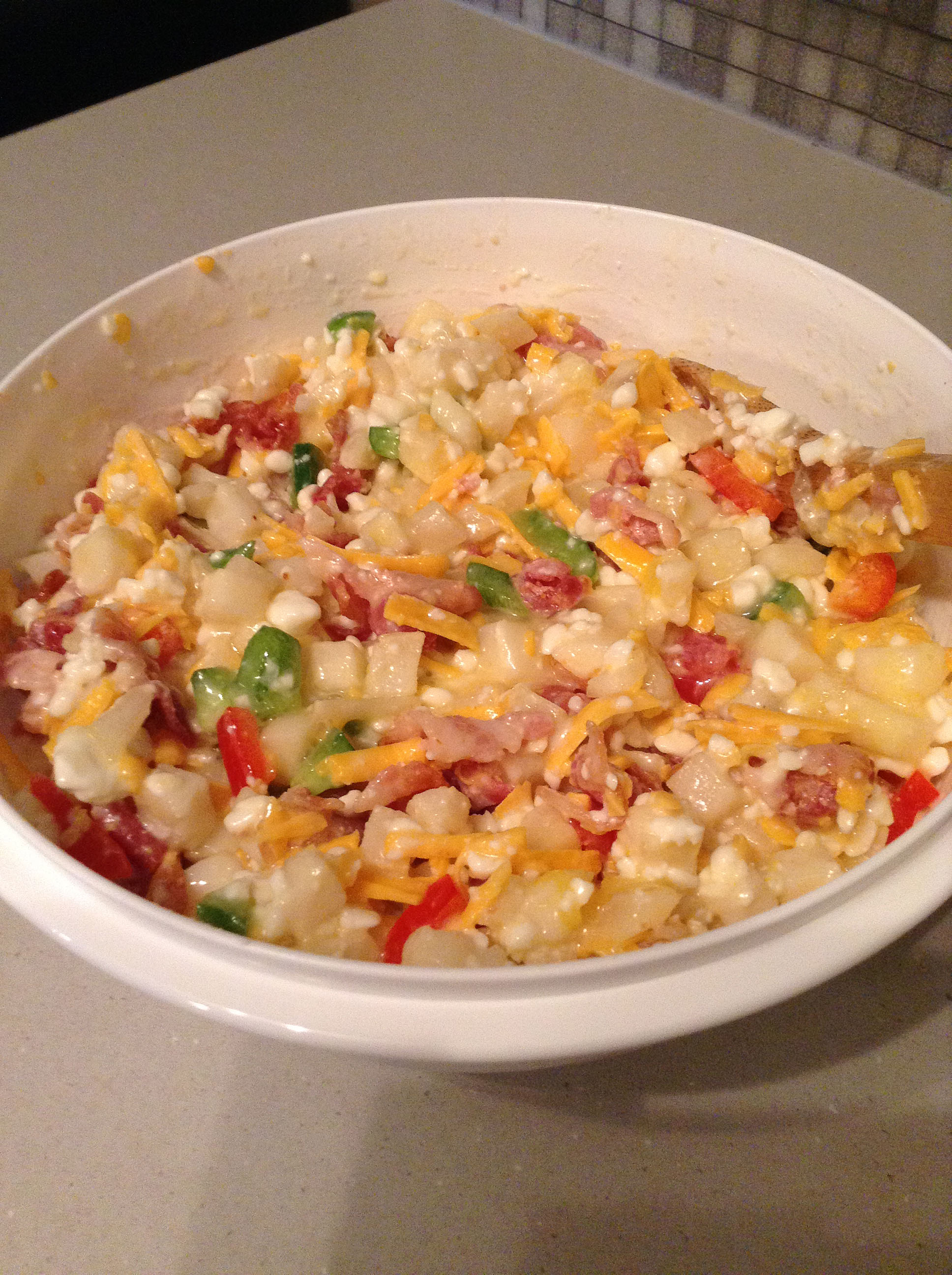 In a large skillet, cook bacon and onion until bacon is crisp; drain and dice bacon. In a large bowl, combine the remaining ingredients; stir in bacon mixture. Transfer to a greased 9″ x 13″ dish. Bake, uncovered, at 350 F for 35 to 40 minutes or until a knife inserted near the centre comes out clean. Yield: 12 servings. This can also be frozen. If you freeze it and then bake it, you’ll have to increase the cooking time.