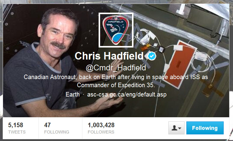 Cmdr Hadfield embraced social media during his time in space. He understands the power of social media. As I was reading his tweets, the thought crossed my mind that the agriculture industry could learn a lesson from Cmdr Hadfield. (Trust me to find a way to link this blog post to agriculture!)