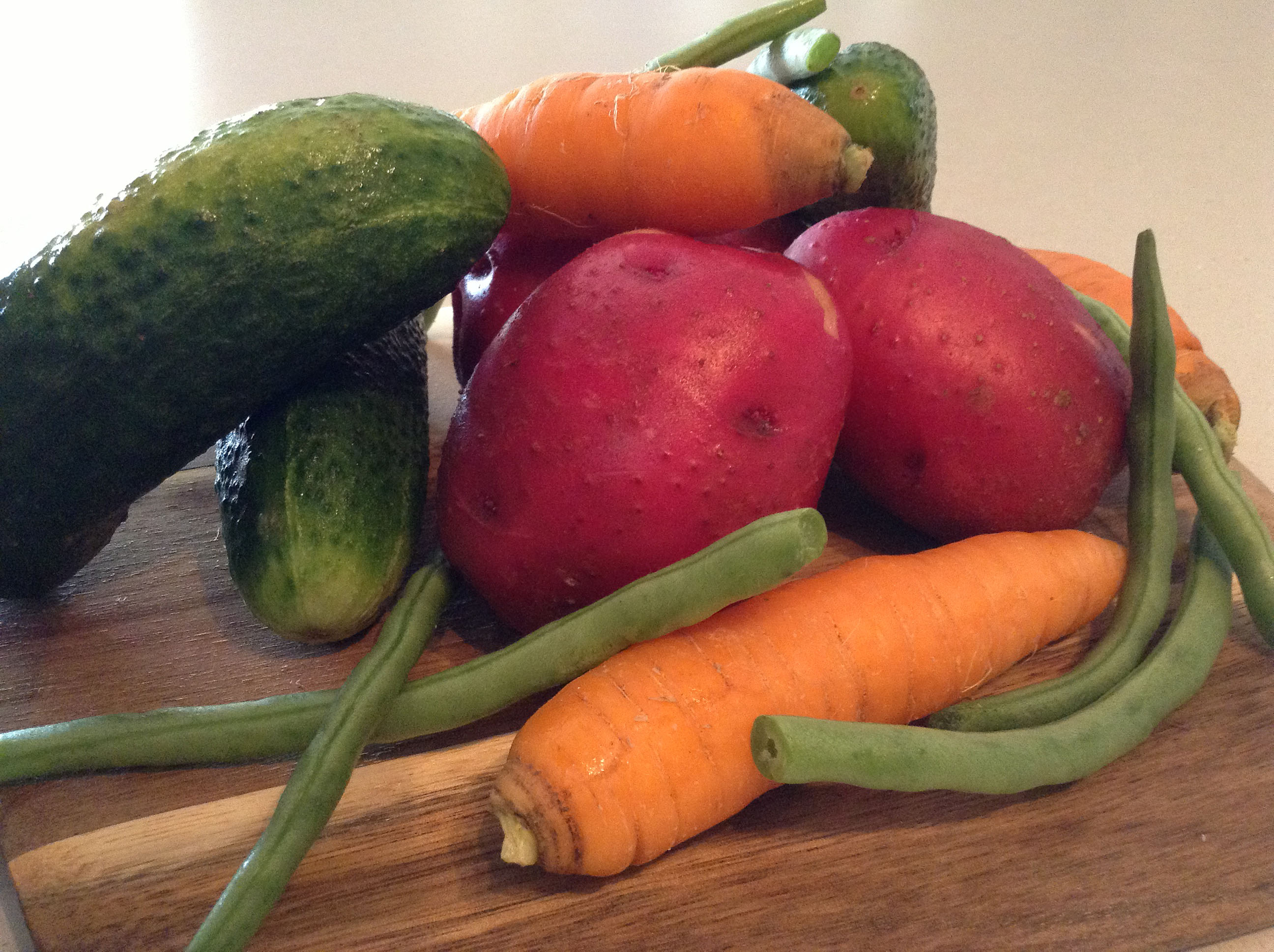 This is just a handful of the produce my mom grows in her large garden. She also grows corn, lettuce, peas, tomatoes, watermelon, raspberries, rhubarb, apples and more.