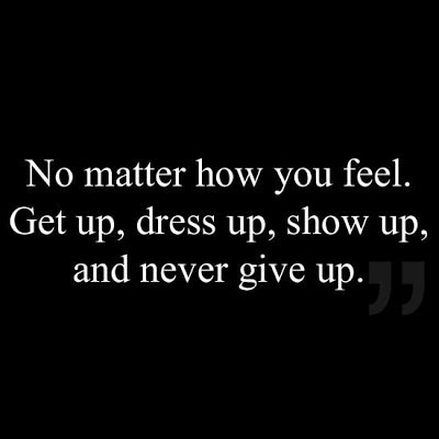 I came across this quote on Pinterest on a day when I needed some encouragement. Everyone has those days where you’d just rather stay in bed or stay home. But no matter how you feel, it’s important to get up, dress up, show up and never give up.